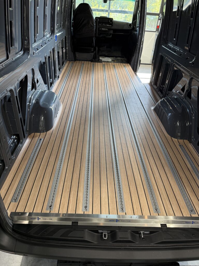 Een ander voordeel van de Smartfloor Revolution is de korte installatietijd. De vloer wordt kant-en-klaar mét vloerzeil geleverd en hoeft alleen nog maar in het voertuig gelijmd te worden.