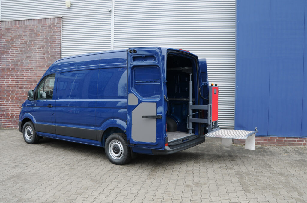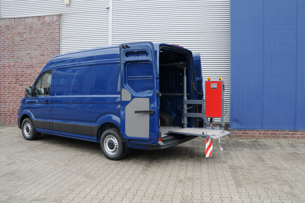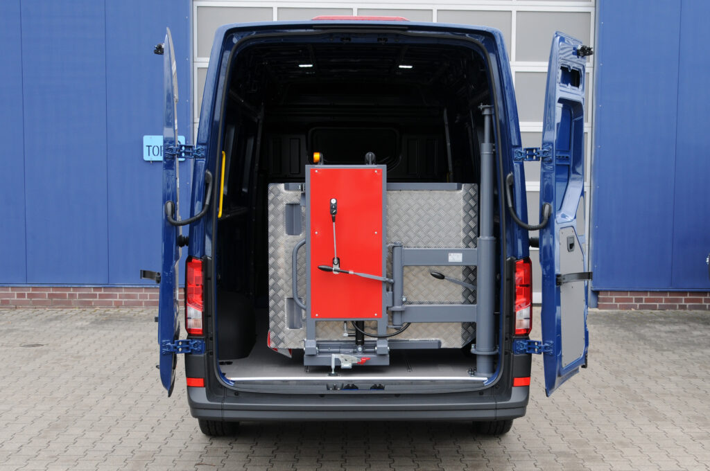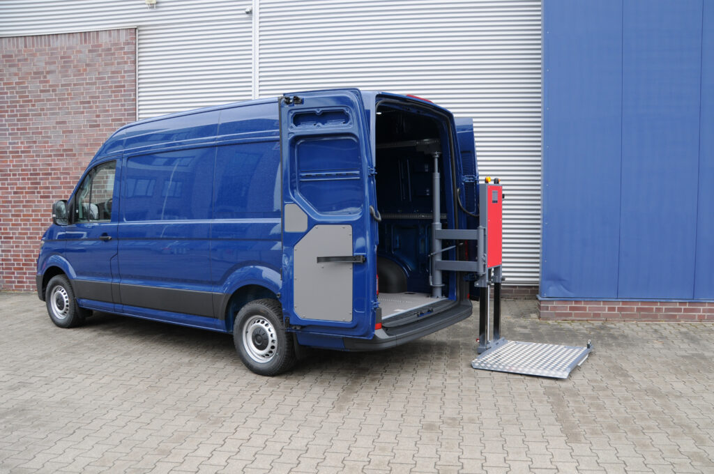 The lift platform is manually folded down and can – depending on the model – be swiveled 2 × 90° or 3 × 90°. The lift offers a load capacity of up to 500 kg and combines user-friendly operation with robust quality.